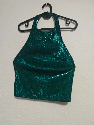Top brillante con lentejuelas verdes, ideal para eventos o para darle un toque especial a tu outfit. - Diseño halter. - Cubierto de lentejuelas. - Tejido con brillo.