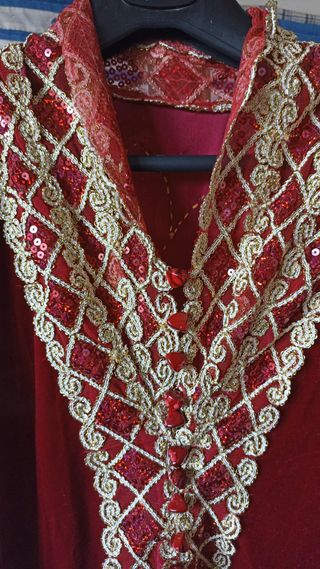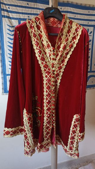 Blusa de estilo árabe para mujer, con un diseño llamativo y detalles de pedrería. - Confeccionada en terciopelo rojo. - Adornada con bordados dorados y lentejuelas. - Cuello y puños con detalles de pedrería. - Cierre frontal con botones. - Medida de sisa a sisa: 52 cm - Medida nuca a dobladillo inferior: 81 cm - Es un vestido auténtico, de segunda mano, pero puede utilizarse para disfraz. #disfraz #carnaval #tunica-arabe #vestido-arabe
