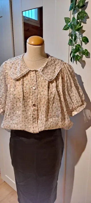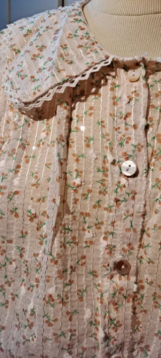 Blusa con estampado floral y detalles brillantes. Presenta un cuello Peter Pan con encaje y mangas cortas abullonadas. - Cierre de botones nacarados - Pequeños detalles de lentejuelas, resaltes blancos e rayas verticales de hilo brillante - Sisa 55.