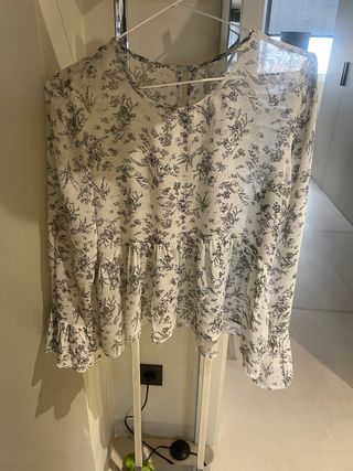 Blusa estilo boho con un bonito estampado floral. - alguna pequeña lentejuela muy discreta en el estampado - Diseño con volantes en el bajo y en las mangas. - Tejido ligero y vaporoso.