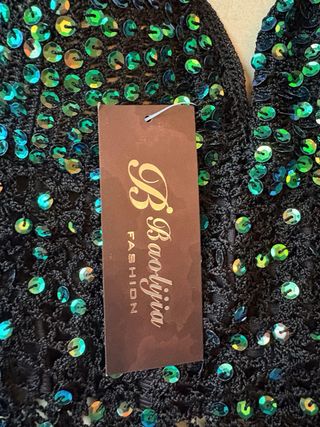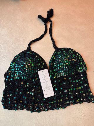 Top con lentejuelas brillantes en tonos negros y verdes. Un diseño llamativo y moderno. - Diseño de lentejuelas. - Estilo halter. - Acabado de crochet.
