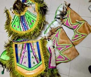 Realizado a mano,Conjunto de disfraz de carnaval con detalles llamativos. - Adornado con plumas marrones y verdes. - Incorpora lentejuelas brillantes en tonos verdes, azules y rosas. - Diseño con detalles en cuero y adornos de flecos. Compuesto por cuello con lazos por detrás que cuelgan, falda, zapatos, antebrazos y blusa
