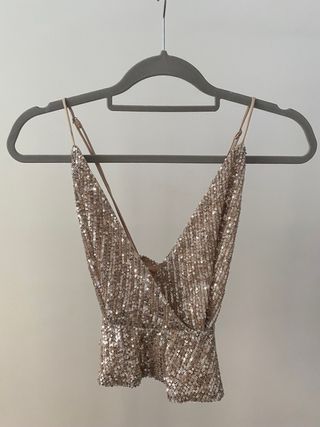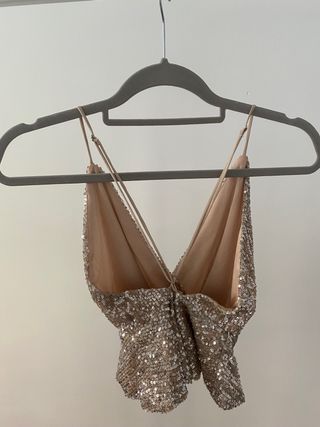 Blusa lentejuelas color rosa palo con lentejuelas gris. Espalda afuera con tirantes cruzados y cierre de corredera. Sólo la use para unas fotos. Está como nueva :)