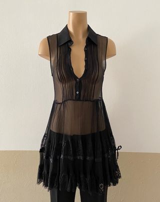 Blusa transparente larga negra con vuelo de encaje e incrustaciones de lentejuelas. Nueva sin estrenar. Talla S. Alto: 85 cm