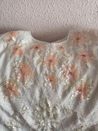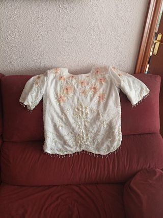 Blusa de fiesta bordada y con acabados de primera. Lleva incrustaciones de lentejuelas transparentes y de color salmón, pequeñas perlitas y otras decoraciones.