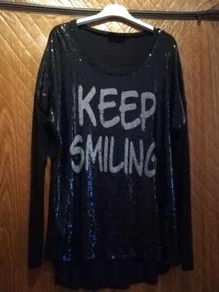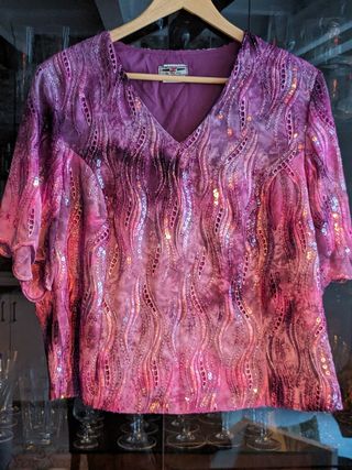 Camiseta/top de fiesta. Tejido sedoso y bordado con lentejuelas. En la etiqueta pone XL pero seria mas una L.
