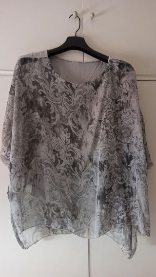 Blusa 100% viscosa, con parte inferior delantera de lentejuelas. Color gris plomo. Made in Italy. Casi sin uso. Talla unica que se corresponde con una M.