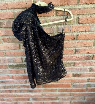Preciosa blusa de lentejuelas negras, ideal para una ocasión especial. ✨ - Escote asimétrico con detalle de choker. - Manga corta abullonada. - Diseño geométrico con lentejuelas brillantes. - Perfecta para eventos nocturnos.