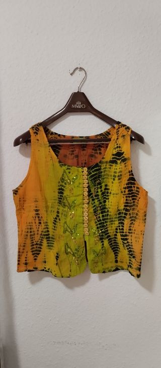 Preciosa blusa sin mangas, ideal para el verano. Es de color amarillo y naranja, con un diseño estampado muy llamativo. - Tiene un cierre de botones en la parte delantera. - Está adornada con lentejuelas y detalles brillantes. - La tela parece ligera y fresca.