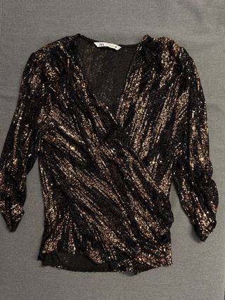 Elegante blusa cruzada de Zara, perfecta para fin de año u ocasiones especiales. Su diseño con lentejuelas aporta un toque brillante y sofisticado. Puesta solo dos veces. - Diseño cruzado. - Detalle de lentejuelas. - Tejido con textura acanalada.