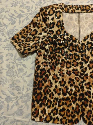 Elegante blusa con estampado de leopardo y detalles brillantes. - Diseño con botones. - Acabado con lentejuelas.