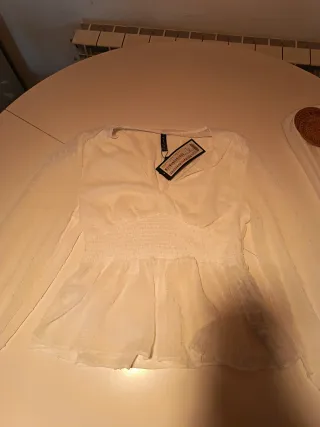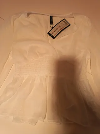 Blusa blanca con un diseño elegante y femenino. Perfecta para cualquier ocasión. - Mangas largas transparentes con pequeños lunares. - Cuerpo fruncido en la cintura para un ajuste favorecedor. - Volantes en el bajo para un toque de estilo. - Escote en V. Nueva con etiqueta