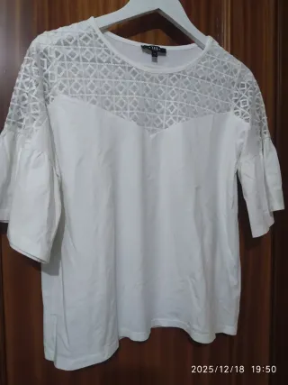 Elegante blusa blanca con un diseño de encaje delicado. Es una prenda ligera y vaporosa, perfecta para añadir un toque sofisticado a cualquier atuendo. Talla M. Nueva sin estrenar. Más cosas en mi perfil. - Diseño de encaje floral. - Manga larga acampanada. - Largo hasta la rodilla.