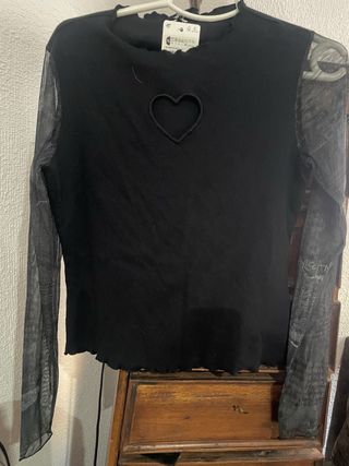 Blusa elegante con un diseño único. - Mangas largas de tul con estampado. - Escote con detalle de corazón. - Acabado festoneado en puños y bajo.