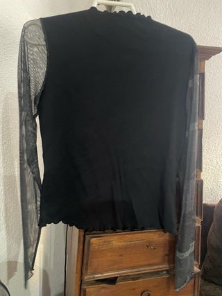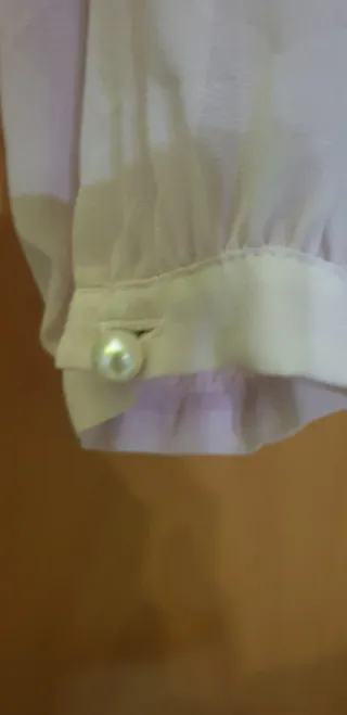 Blusa de manga larga con un diseño ligero y vaporoso. Perfecto estado Escote elástico. Puños y bajo con volantes. Tejido con pequeños topos. Mangas transparentes