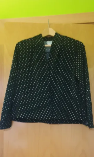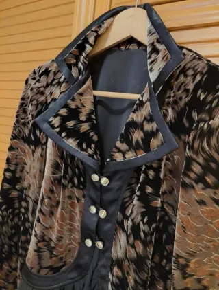REBAJADA! Hermosa blusa vintage estilo blazer, manga larga con elegante solapa y bellos detalles de gasa transparente en mangas y bajos. • Tejido delgado estilo aterciopelado combinado con elastano que se ajusta al cuerpo. • Diseño estampado en tonos negro, beige, marrón y delicados destellos dorados que van a juego con los 6 botones frontales. • Tiene tela negra transparente con volantes en bajos y terminaciones de las mangas. Poco uso. Algún desgaste menor. Excelente estado. Sirve para talla M ó L. IMPORTANTE ver medidas: Largo: 55 cm. Pecho: 48 cm. Envíos: Sí. Entregas: Metro Sagrada Familia. Visita mi PERFIL. SÍGUEME :)