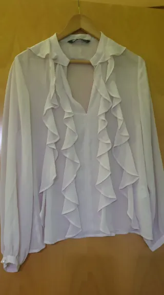 Elegante blusa de Zara con detalles de volantes. - Diseño con escote en V. - Mangas largas abullonadas. - Cierre en puño con botón.