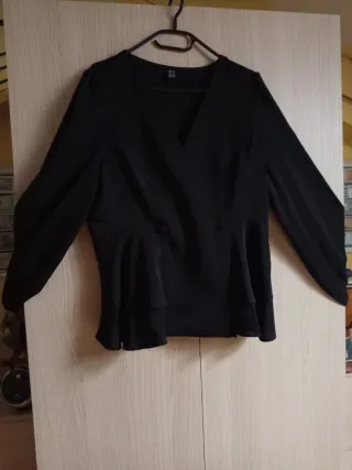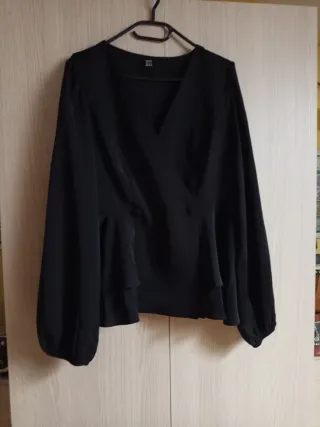 Elegante blusa negra con un diseño moderno. - Escote en V cruzado. - Mangas largas abullonadas. - Detalle de volante en la cintura.