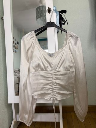 Elegante blusa de manga larga con un diseño fruncido en la parte delantera que le da un toque moderno y favorecedor. El tejido satinado aporta un brillo sutil y una caída muy bonita. - Diseño fruncido central. - Mangas largas abullonadas. - Detalle de cordón en la parte inferior.