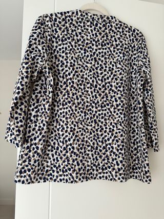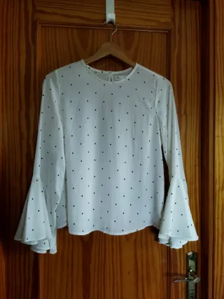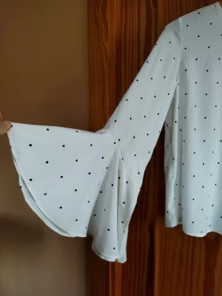 Blusa de Sfera con fondo blanco y pequeños lunares negros. Manga larga acampanada. Tejido ligero. Ancho de sisa a sisa 48.5 cm Largo 58.5 cm Compra solidaria por los animales sin hogar. Gracias por colaborar.