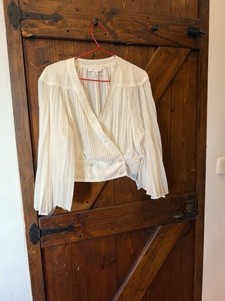 Blusa romántica de gasa con un diseño plisado y favorecedor escote cruzado. - Mangas acampanadas. - Detalle de botones en la cintura. - Tejido ligero y vaporoso.