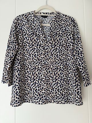Blusa de señora con un estampado llamativo y moderno. - Diseño con cuello mao y manga 3/4. - Tejido ligero y cómodo. - Estampado de manchas en tonos beige y azul.