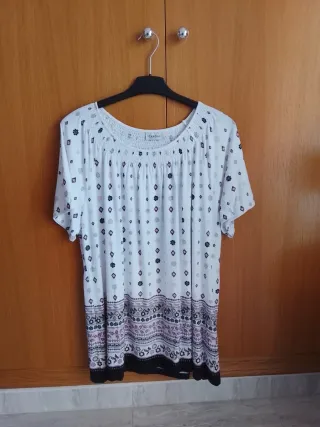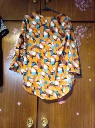 Blusa amplia con estampado floral y detalles geométricos. El cuello es elástico y fruncido, con mangas cortas. - Diseño con estampado de rombos y flores. - Banda decorativa en el bajo con motivos florales y geométricos. - Tejido ligero y cómodo. -Como nueva -Para mujer