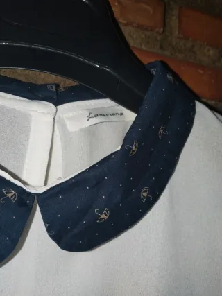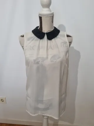 Elegante blusa blanca sin mangas con un distintivo cuello Peter Pan negro. Perfecta para un look sofisticado. - Cuello Peter Pan negro. - Diseño sin mangas. - Tejido ligero y vaporoso.
