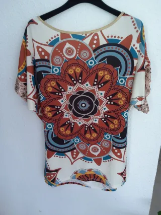 Blusa con cuello redondo, manga corta con detalle Estampado central tipo mandala en tonos tierra, azul y blanco. Talla/L