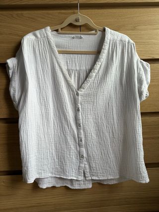 Blusa blanca de manga corta con textura. Cuello en V. Cierre de botones. Tejido ligero tipo muselina.