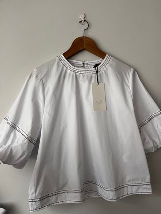 Blusa de Zara con un diseño elegante y detalles de pespuntes. - Cuello redondo. - Manga abullonada. - Pespuntes decorativos en mangas, cuello y bajo.