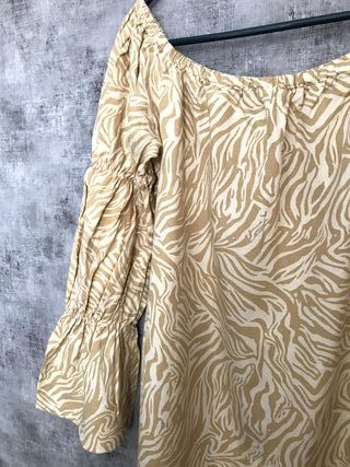 Blusa de Zara con un bonito decorado en tonos blancos y azules con destellos dorados. Presenta un escote en pico y mangas largas abullonadas. - Diseño con estampado. - Escote en pico. - Mangas largas abullonadas. - Bajo elástico. - Detalles dorados.