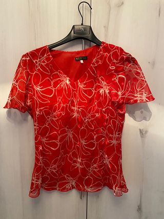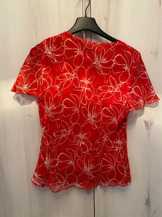 Elegante blusa de manga corta con un llamativo estampado floral. - Diseño con escote en V. - Tejido ligero y vaporoso. - Estampado de flores blancas sobre fondo rojo.
