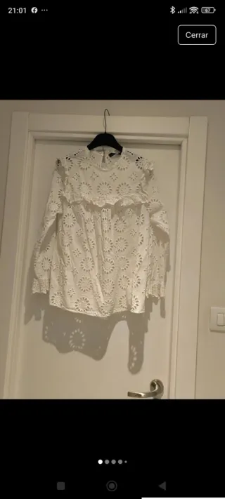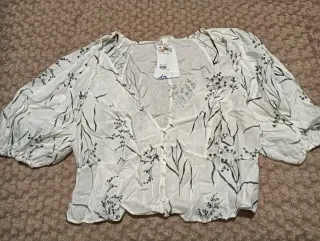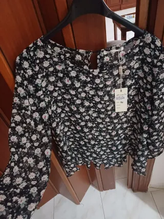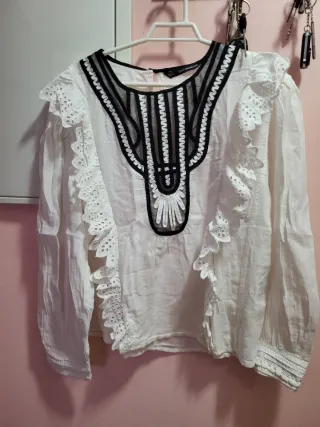 Elegante blusa de Zara con un delicado bordado floral. - Diseño con cuello alto y mangas largas. - Tejido ligero y transpirable. - Detalle de volantes en el cuello y puños.