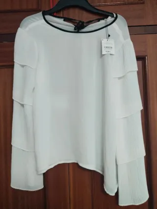 Blusa blanca elegante con detalles de volantes en las mangas. - Diseño de manga larga. - Cuello redondo con ribete negro. - Cierre de lazada en la espalda. - Tejido ligero y vaporoso.