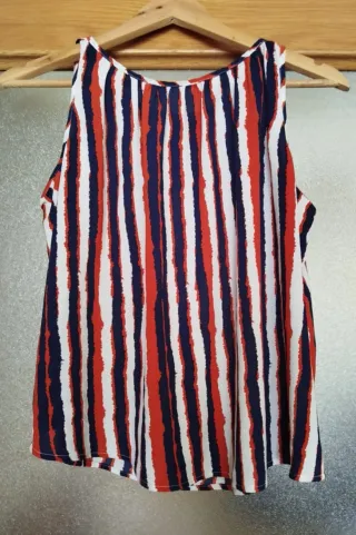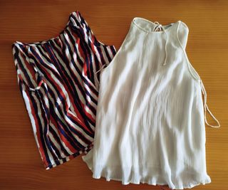Conjunto de dos blusas sin mangas, talla M - Una blusa con estampado de rayas verticales en colores rojo, blanco y azul marino. Marca Lefties - Otra blusa lisa de color blanco con tejido plisado y detalle de lazada en el cuello, con transparencias marca Mango.