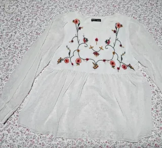 Bonita blusa blanca con un delicado bordado floral en la parte delantera. Ideal para un look fresco y femenino. - Diseño con bordado de flores y ramas. - Mangas largas. - Tejido ligero con textura de puntos.