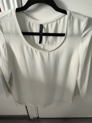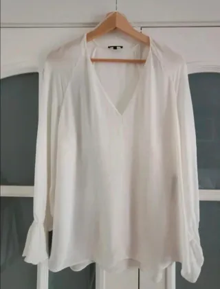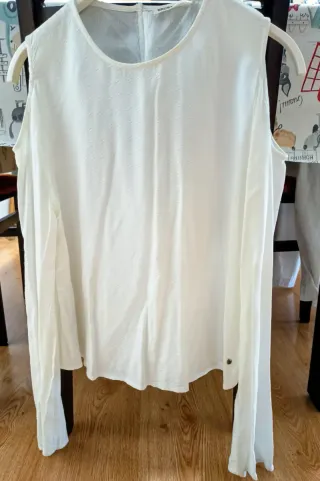 Blusa blanca de manga larga con hombros descubiertos. - Diseño con hombros al descubierto. - Mangas largas acampanadas. - Tejido ligero con un sutil brillo y pequeños bordados. Está nueva, sin estrenar. Si ves algo más en mi perfil podemos hablar de descuentos. AVISO IMPORTANTE: No se hacen envíos, recogida del artículo en Sant Joan Despí. Tampoco hago excepciones.