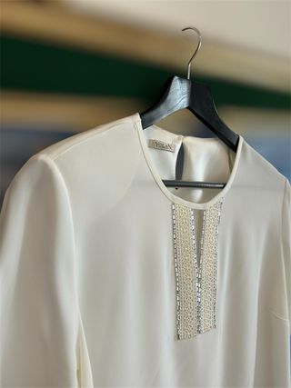 Elegante blusa de la marca Yolan. - Diseño con detalles de pedrería y encaje en el escote. - Manga larga. - Tejido ligero y fluido. - Cremallera lateral