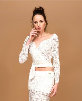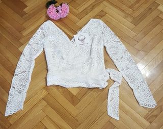 Elegante blusa de encaje con manga larga. - Diseño con escote en V. - Cinturón de tela a juego. - Estilo crop top.