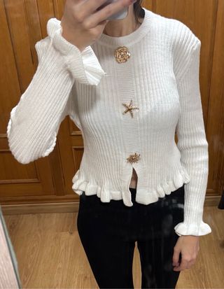 Blusa de punto blanco con detalles decorativos. - Diseño de manga larga. - Adornos de flor y estrella. - Volantes en puños y bajo.