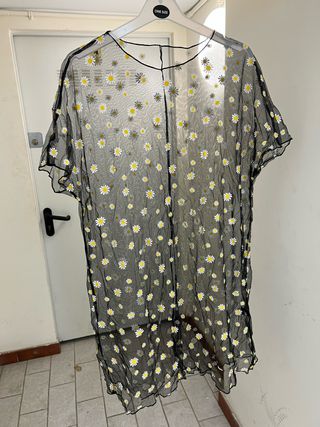 Blusa transparente con un estampado de flores blancas y amarillas. - Diseño de manga corta. - Tejido ligero y vaporoso. - Estampado floral llamativo. - Usado una vez Medidas: ⁃ Sisa 68 cm ⁃ Largo 100 cm