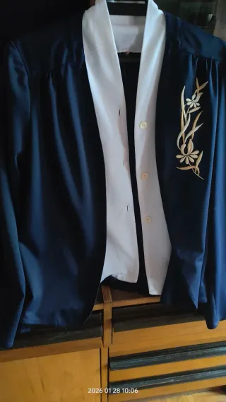 Conjunto de chaqueta manga larga y blusa sin manga, de verano - Chaqueta azul con bordado floral. - Blusa con bordado, blanca por delante y azul marino por detras