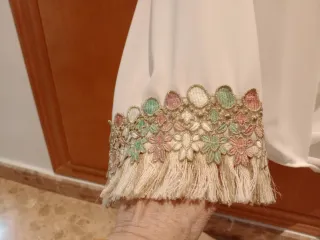 Elegante blusa blanca con un diseño cruzado y detalles únicos en los puños. - Puños con bordado multicolor y flecos. - Diseño cruzado frontal. - Manga larga.
