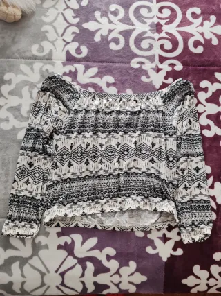 Blusa de manga larga con un llamativo estampado. - Diseño con escote Bardot. - Estampado geométrico en blanco y negro. - Bajo y puños con goma.