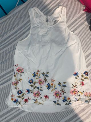 Bonita blusa blanca con un delicado bordado floral en la parte inferior. - Diseño sin mangas. - Bordados de flores en tonos rosas, azules y rojos. - Cuello redondo con detalle fruncido en la espalda.