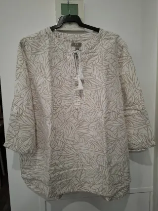 Blusa de lino con un bonito estampado de hojas en tonos beige y blanco. Tiene un diseño con cuello redondo y cierre de cordones con borlas. - Manga larga - Cierre de botones en la parte delantera - Estampado de hojas