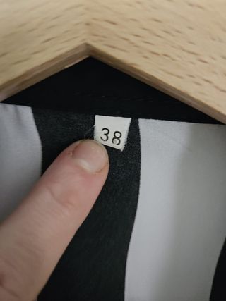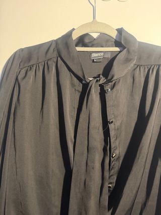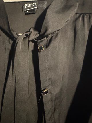 Elegante blusa de la marca Blanco. Talla L lazada al cuello,boyones cuadrados dirados y negro. Manga y bajos acabados en goma - Diseño con cuello - Cierre de botones - Tejido ligero