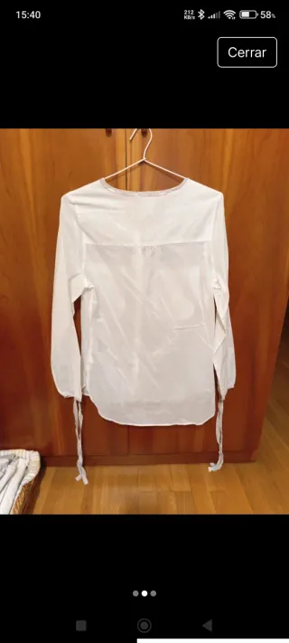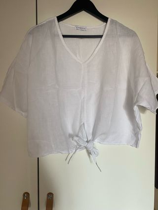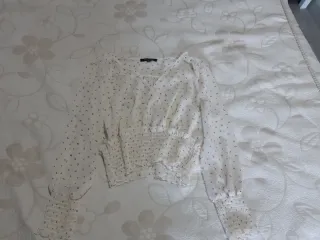 Elegante blusa de Zara en color blanco, con un detalle de lazo en el cuello. - Lazo decorativo en el cuello (puede anudarse al frente o a un lado) - Manga larga con puños - Corte ligeramente entallado para un look femenino - Ideal para oficina, eventos o looks casuales de día a noche. La vendo porque me va larga.