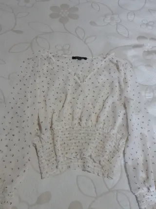 Bonita blusa blanca con bordados florales en el pecho y mangas. - Diseño con escote en V. - Mangas cortas con volantes. - Tejido ligero y calado. Entrega en mano en Barcelona o en osona o envio por correo o wallapop